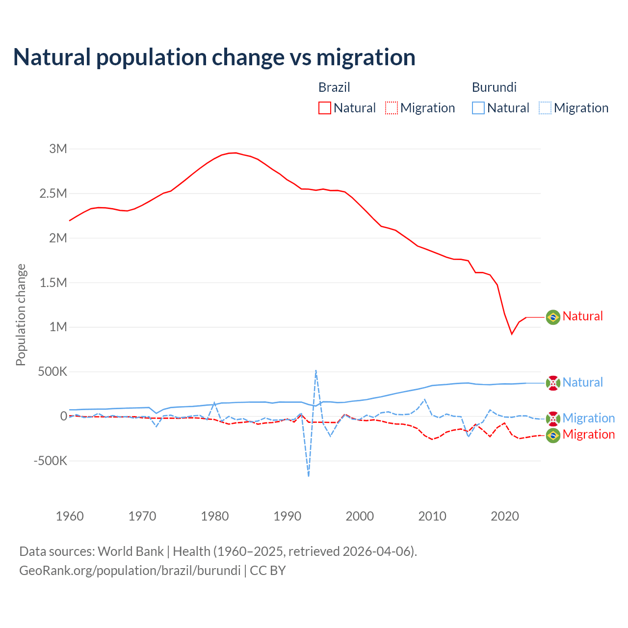Over the last 10 years, 89.1% of the population change in Brazil is from natural causes (a gain of 14,004,164 people) and 10.9% is from migration (a loss of 1,708,894 people). In Burundi 91% is from natural causes (a gain of 3,614,502 people) and 9.03% is from migration (a loss of 358,928 people).