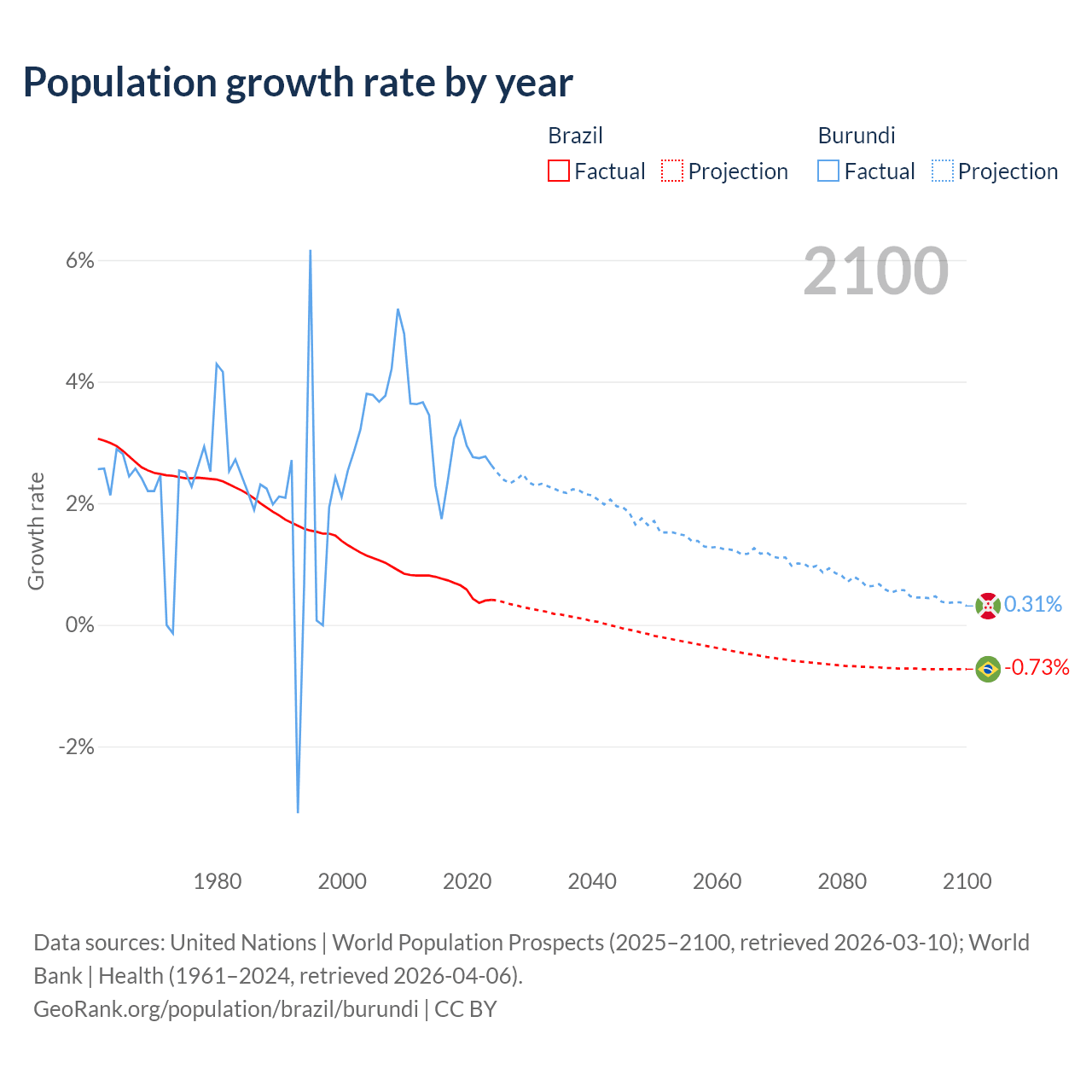 - For the last 10 years, Brazil has had an average growth rate of +0.6% per year vs +2.74% in Burundi.