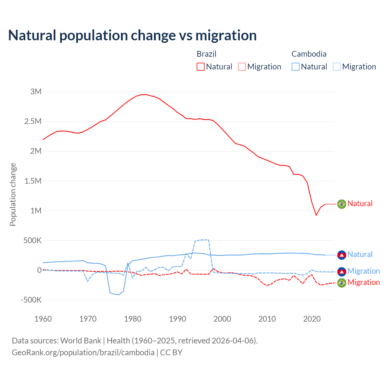 Over the last 10 years, 89.1% of the population change in Brazil is from natural causes (a gain of 14,004,164 people) and 10.9% is from migration (a loss of 1,708,894 people). In Cambodia 85.2% is from natural causes (a gain of 2,724,147 people) and 14.8% is from migration (a loss of 474,505 people).