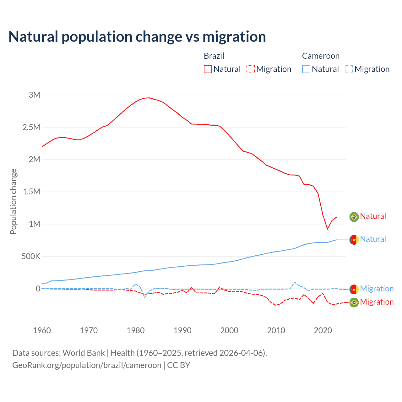 Over the last 10 years, 89.1% of the population change in Brazil is from natural causes (a gain of 14,004,164 people) and 10.9% is from migration (a loss of 1,708,894 people). In Cameroon 99.1% is from natural causes (a gain of 6,982,395 people) and 0.9% is from migration (a gain of 63,139 people).
