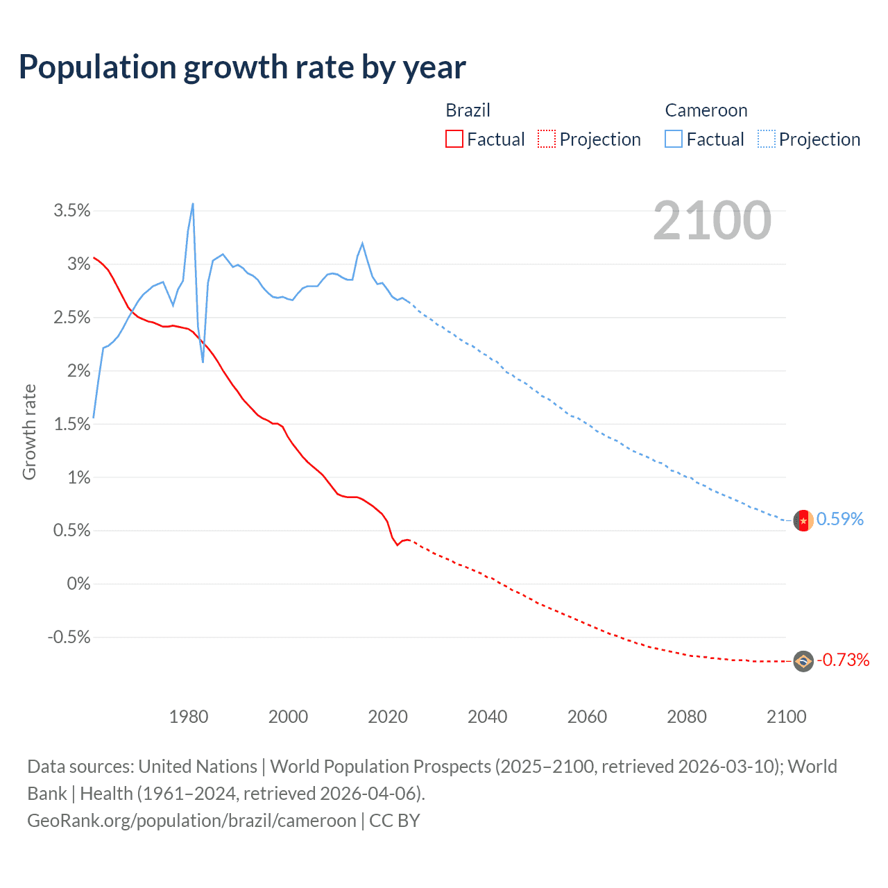 - For the last 10 years, Brazil has had an average growth rate of +0.6% per year vs +2.84% in Cameroon.