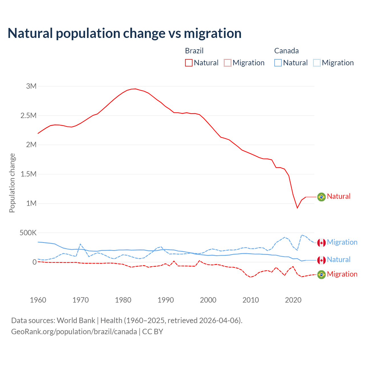 Over the last 10 years, 89.1% of the population change in Brazil is from natural causes (a gain of 14,004,164 people) and 10.9% is from migration (a loss of 1,708,894 people). In Canada 19.4% is from natural causes (a gain of 789,345 people) and 80.6% is from migration (a gain of 3,276,554 people).
