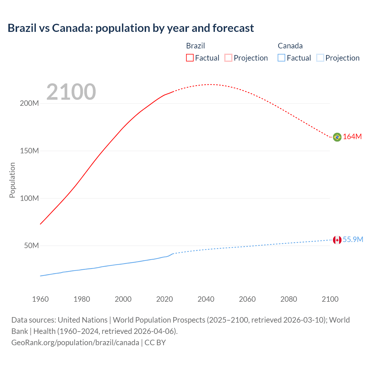 Brazil vs Canada: population by year and forecast