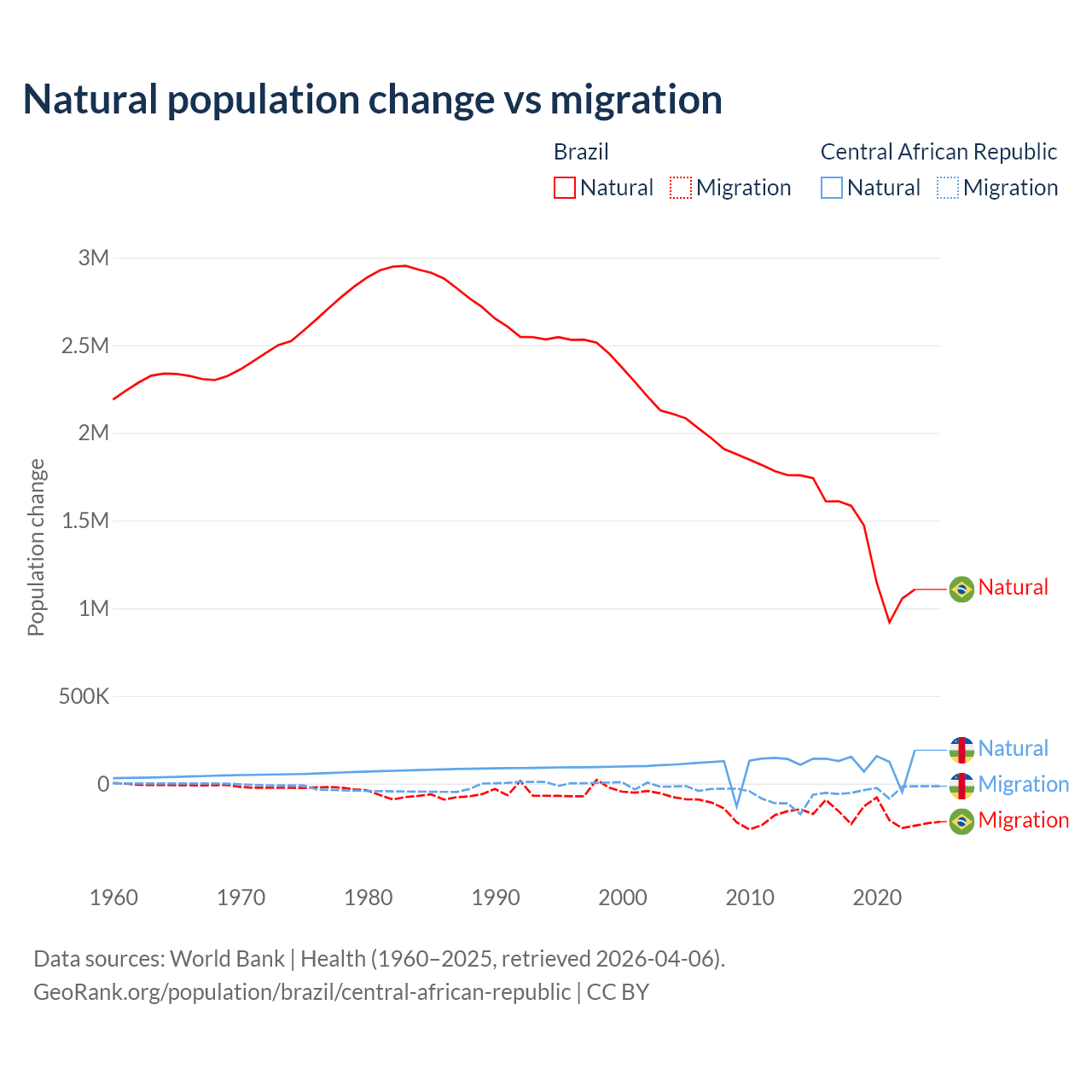 Over the last 10 years, 89.1% of the population change in Brazil is from natural causes (a gain of 14,004,164 people) and 10.9% is from migration (a loss of 1,708,894 people). In the Central African Republic 66.7% is from natural causes (a gain of 1,164,312 people) and 33.3% is from migration (a loss of 580,593 people).