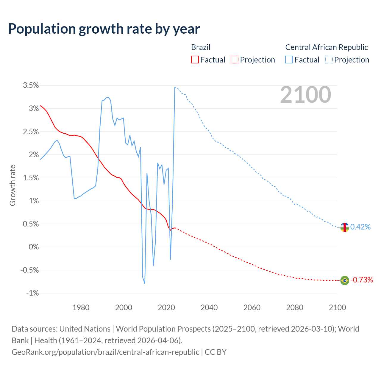 - For the last 10 years, Brazil has had an average growth rate of +0.6% per year vs +1.27% in the Central African Republic.