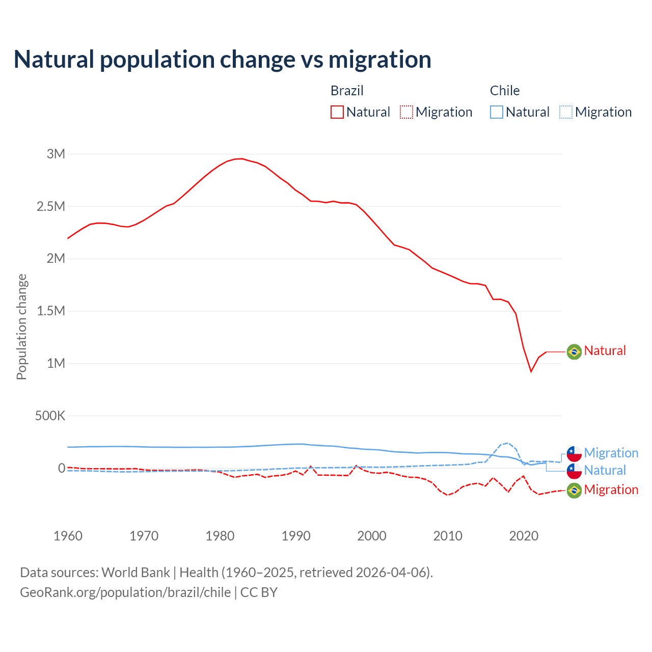 Over the last 10 years, 89.1% of the population change in Brazil is from natural causes (a gain of 14,004,164 people) and 10.9% is from migration (a loss of 1,708,894 people). In Chile 43.5% is from natural causes (a gain of 844,683 people) and 56.5% is from migration (a gain of 1,097,597 people).