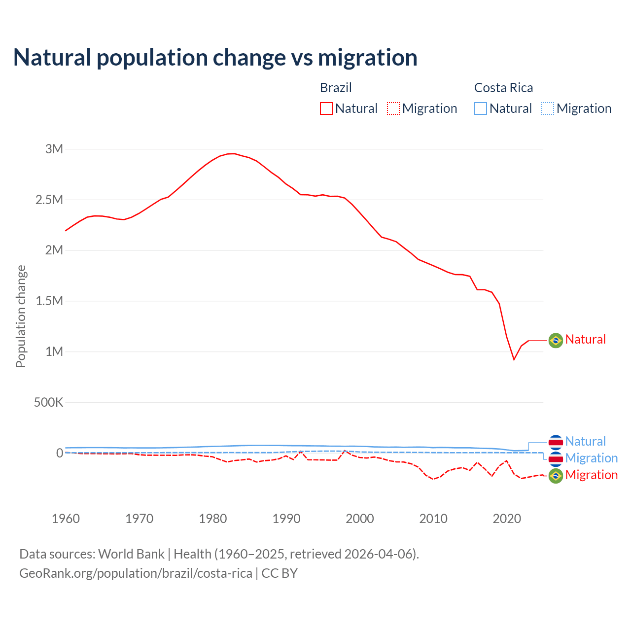 Over the last 10 years, 89.1% of the population change in Brazil is from natural causes (a gain of 14,004,164 people) and 10.9% is from migration (a loss of 1,708,894 people). In Costa Rica 96.3% is from natural causes (a gain of 362,624 people) and 3.69% is from migration (a gain of 13,900 people).