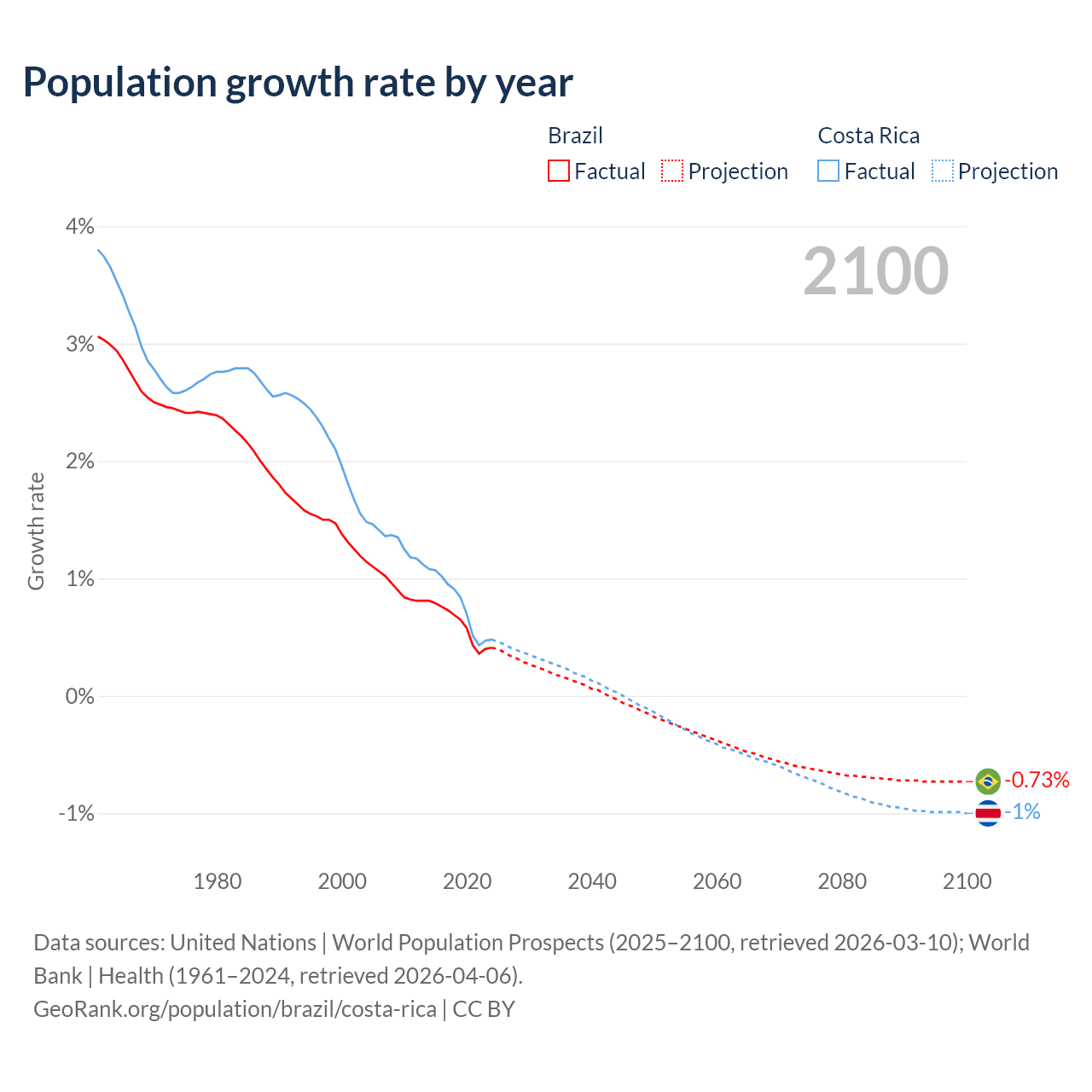 - For the last 10 years, Brazil has had an average growth rate of +0.6% per year vs +0.77% in Costa Rica.