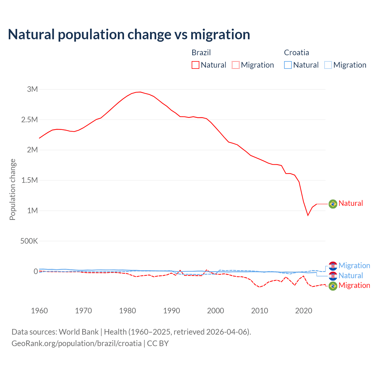 Over the last 10 years, 89.1% of the population change in Brazil is from natural causes (a gain of 14,004,164 people) and 10.9% is from migration (a loss of 1,708,894 people). In Croatia 54.8% is from natural causes (a loss of 177,803 people) and 45.2% is from migration (a loss of 146,770 people).