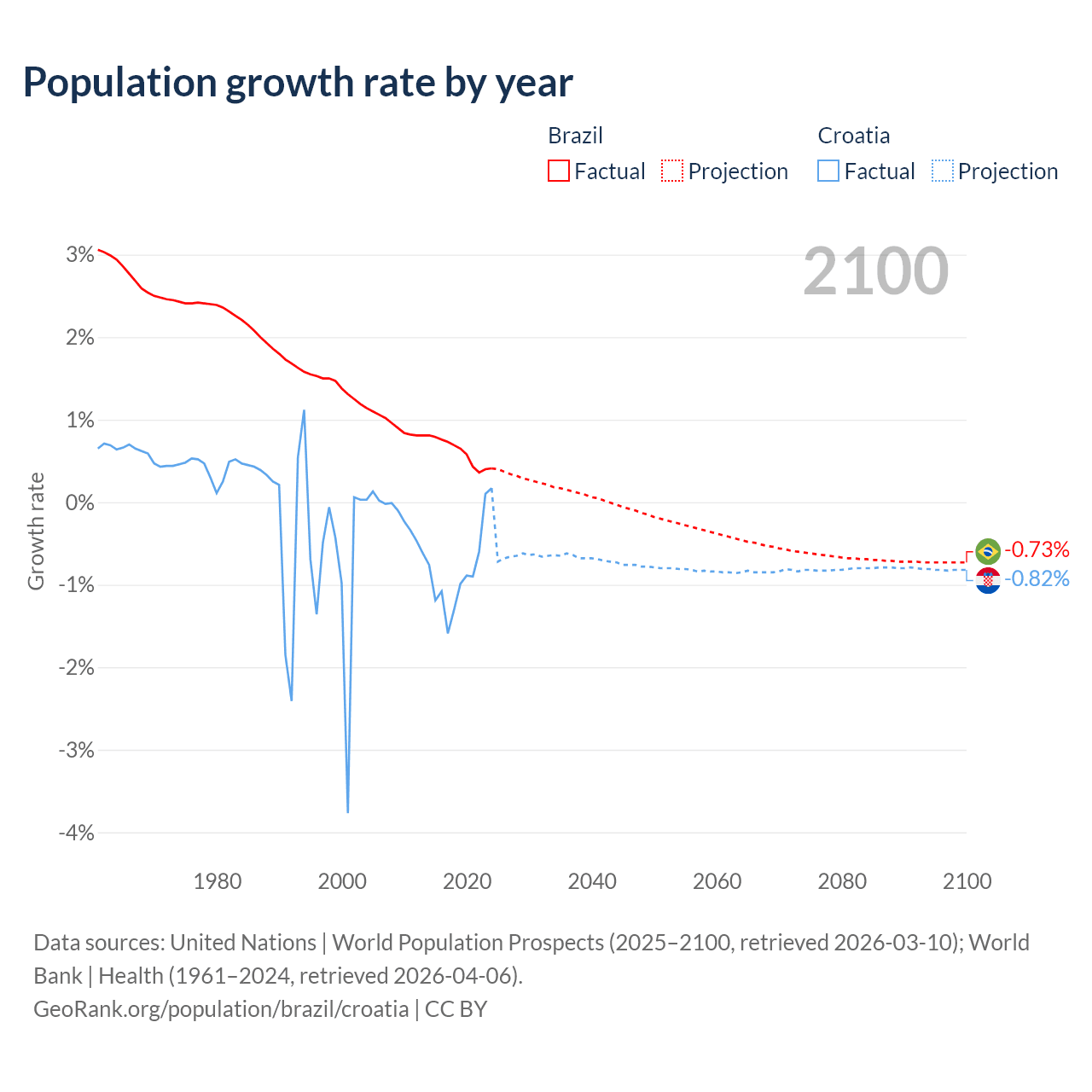 - For the last 10 years, Brazil has had an average growth rate of +0.6% per year vs -0.82% in Croatia.