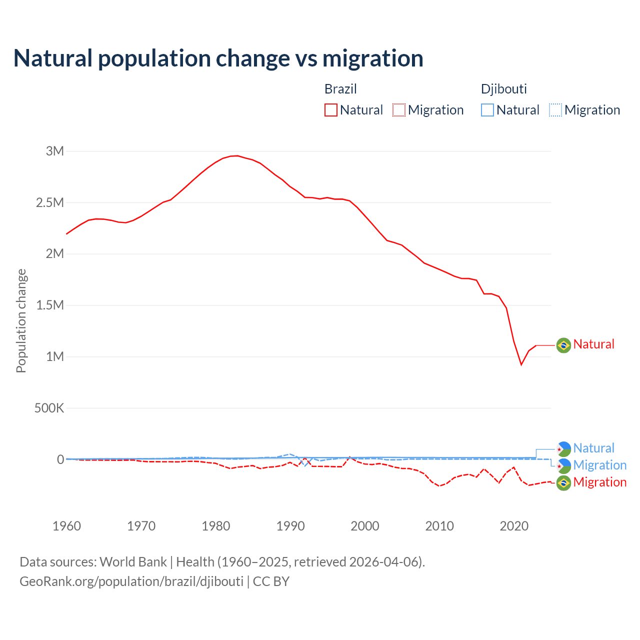 Over the last 10 years, 89.1% of the population change in Brazil is from natural causes (a gain of 14,004,164 people) and 10.9% is from migration (a loss of 1,708,894 people). In Djibouti 92.1% is from natural causes (a gain of 153,892 people) and 7.87% is from migration (a gain of 13,138 people).
