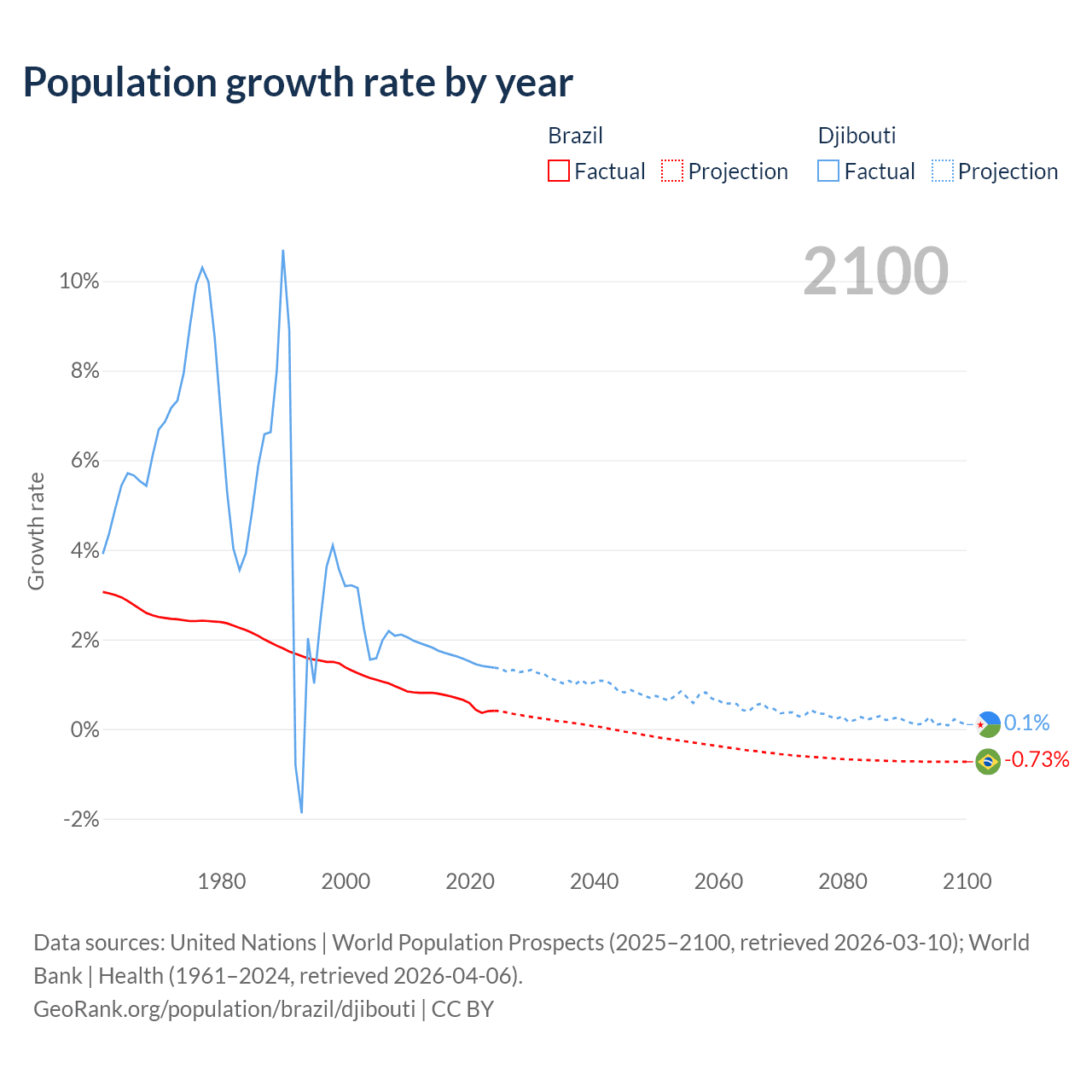 - For the last 10 years, Brazil has had an average growth rate of +0.6% per year vs +1.57% in Djibouti.