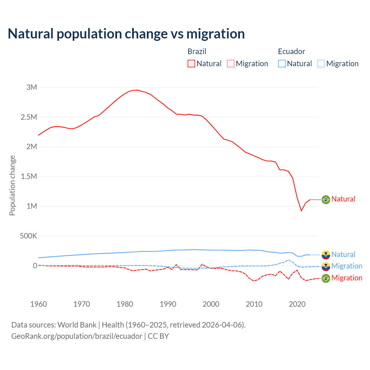 Over the last 10 years, 89.1% of the population change in Brazil is from natural causes (a gain of 14,004,164 people) and 10.9% is from migration (a loss of 1,708,894 people). In Ecuador 91.9% is from natural causes (a gain of 1,964,352 people) and 8.08% is from migration (a gain of 172,707 people).