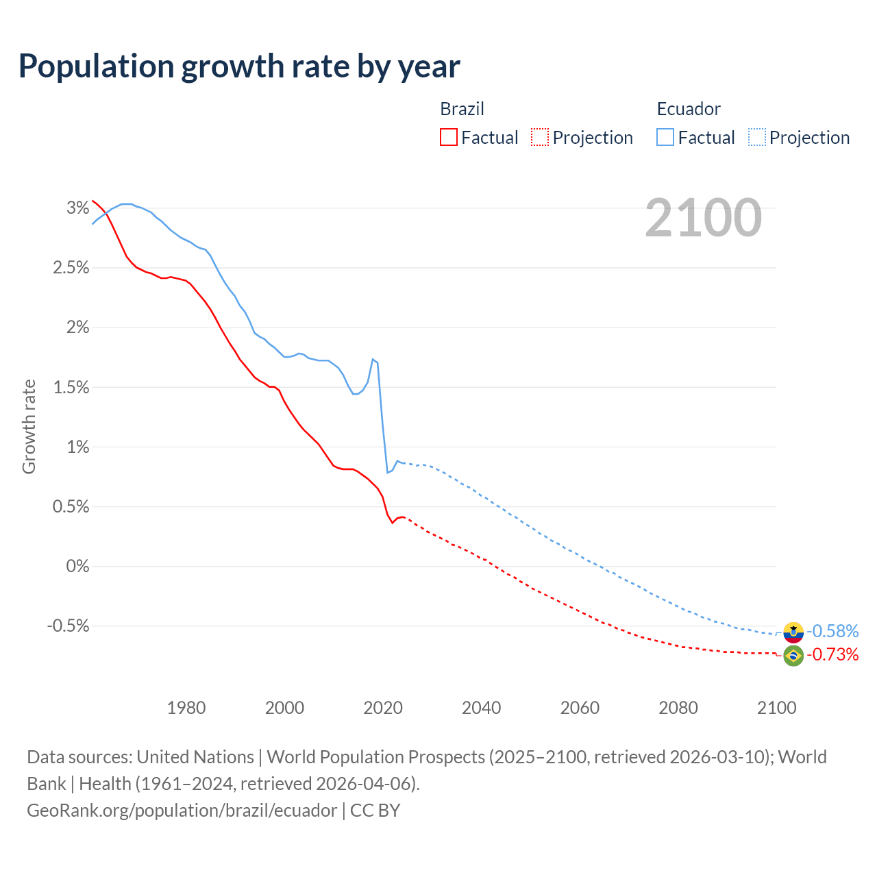 - For the last 10 years, Brazil has had an average growth rate of +0.6% per year vs +1.26% in Ecuador.