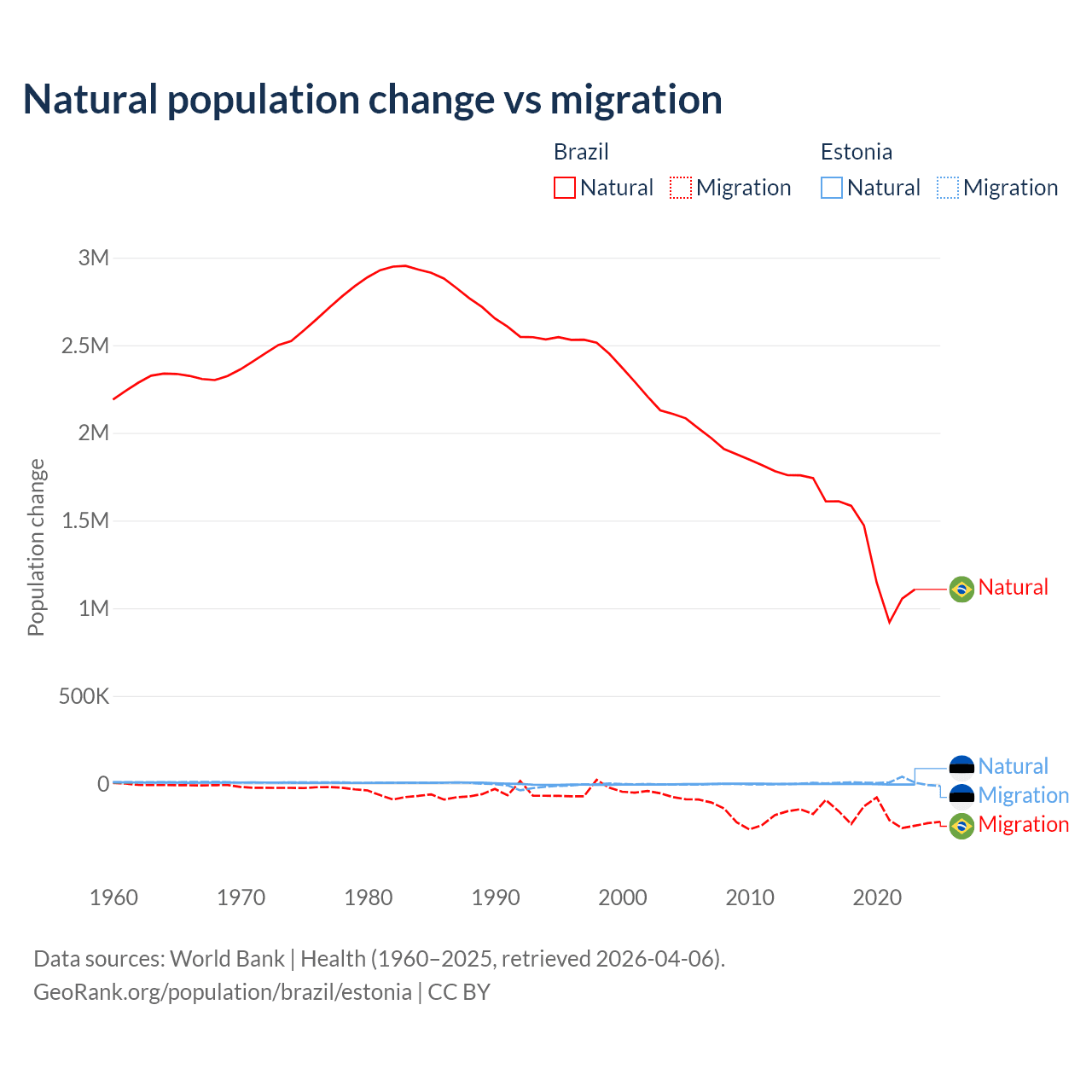 Over the last 10 years, 89.1% of the population change in Brazil is from natural causes (a gain of 14,004,164 people) and 10.9% is from migration (a loss of 1,708,894 people). In Estonia 26.1% is from natural causes (a loss of 27,683 people) and 73.9% is from migration (a gain of 78,553 people).