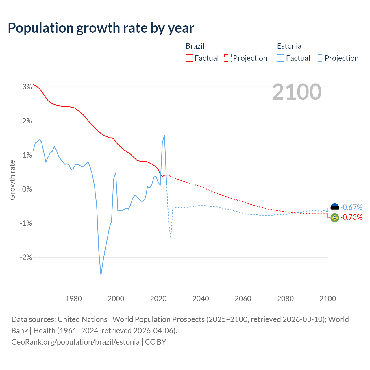 - For the last 10 years, Brazil has had an average growth rate of +0.6% per year vs +0.37% in Estonia.