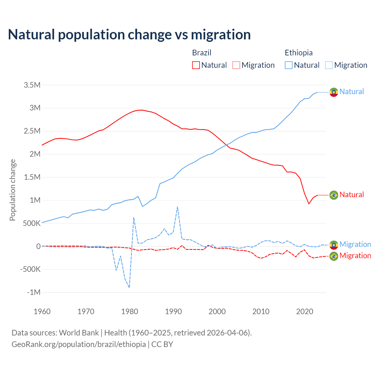 Over the last 10 years, 89.1% of the population change in Brazil is from natural causes (a gain of 14,004,164 people) and 10.9% is from migration (a loss of 1,708,894 people). In Ethiopia 98.8% is from natural causes (a gain of 30,237,373 people) and 1.19% is from migration (a gain of 365,488 people).