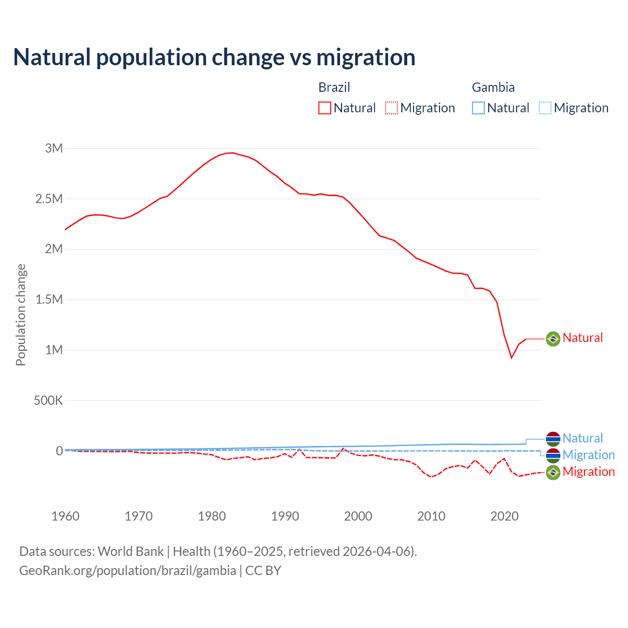Over the last 10 years, 89.1% of the population change in Brazil is from natural causes (a gain of 14,004,164 people) and 10.9% is from migration (a loss of 1,708,894 people). In the Gambia 95.2% is from natural causes (a gain of 625,795 people) and 4.75% is from migration (a loss of 31,227 people).
