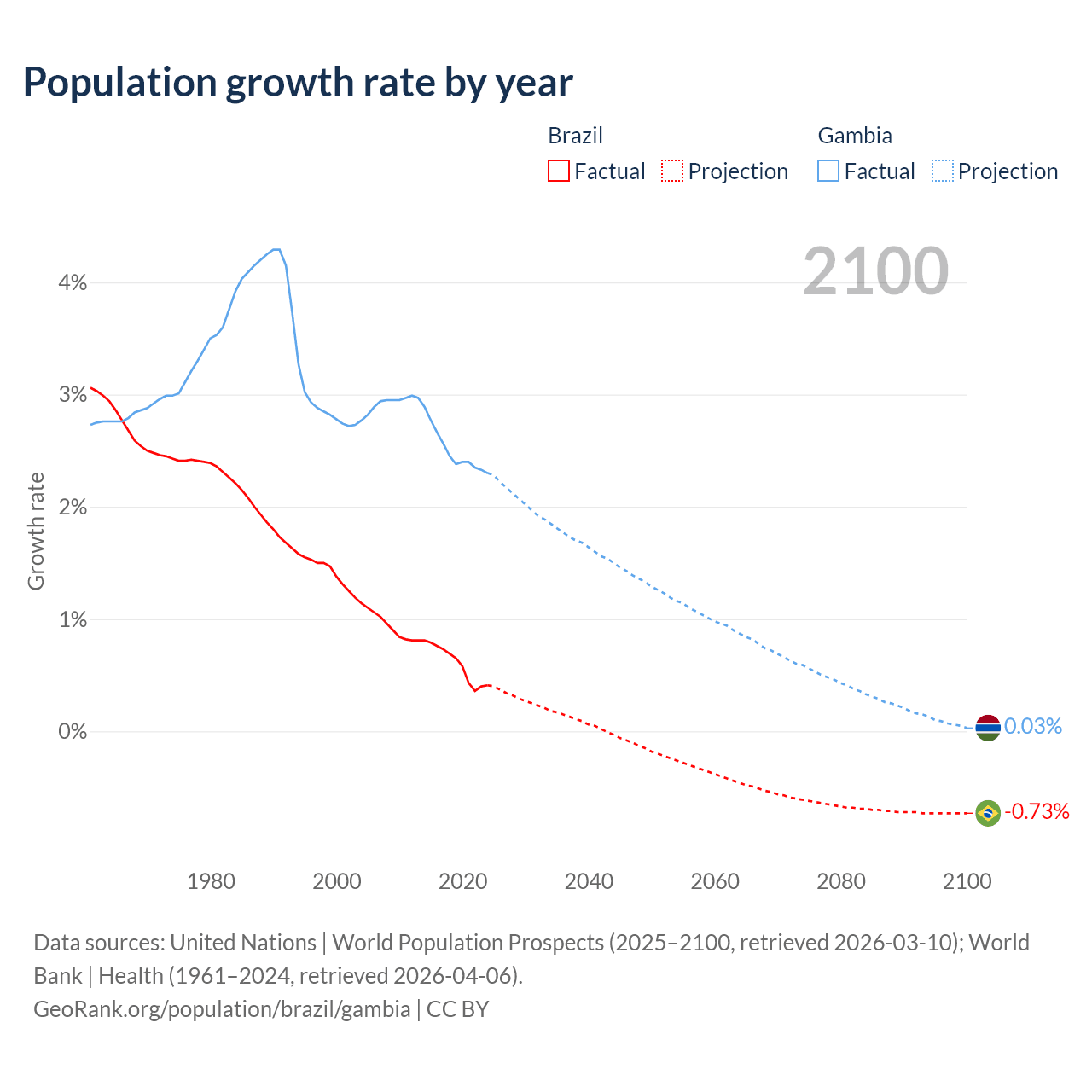 - For the last 10 years, Brazil has had an average growth rate of +0.6% per year vs +2.5% in the Gambia.