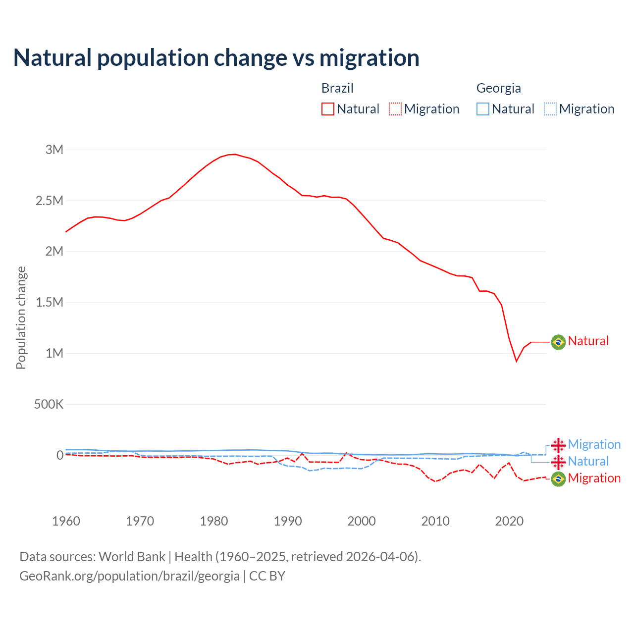 Over the last 10 years, 89.1% of the population change in Brazil is from natural causes (a gain of 14,004,164 people) and 10.9% is from migration (a loss of 1,708,894 people). In Georgia 57.7% is from natural causes (a gain of 47,646 people) and 42.3% is from migration (a loss of 34,907 people).
