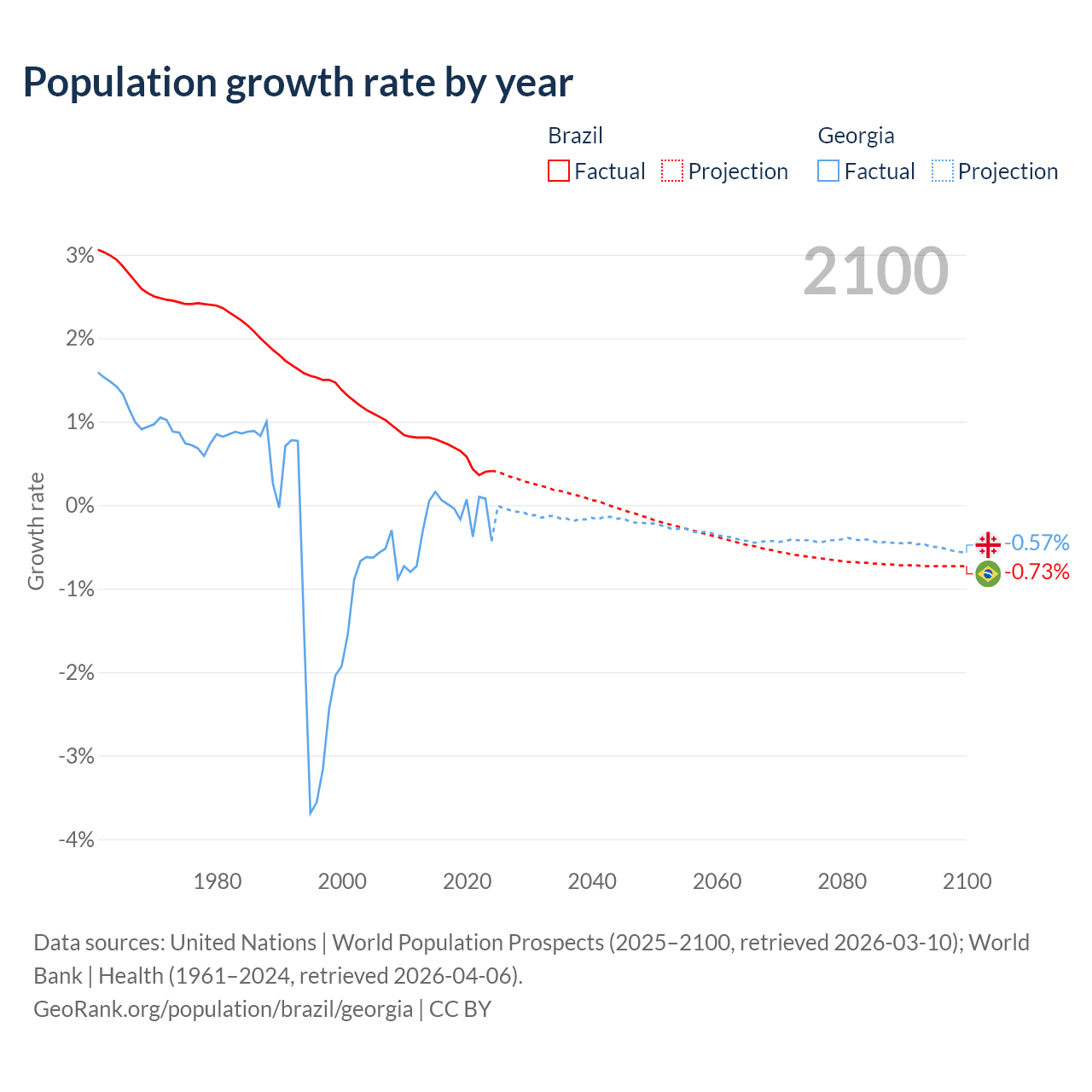 - For the last 10 years, Brazil has had an average growth rate of +0.6% per year vs -0.04% in Georgia.