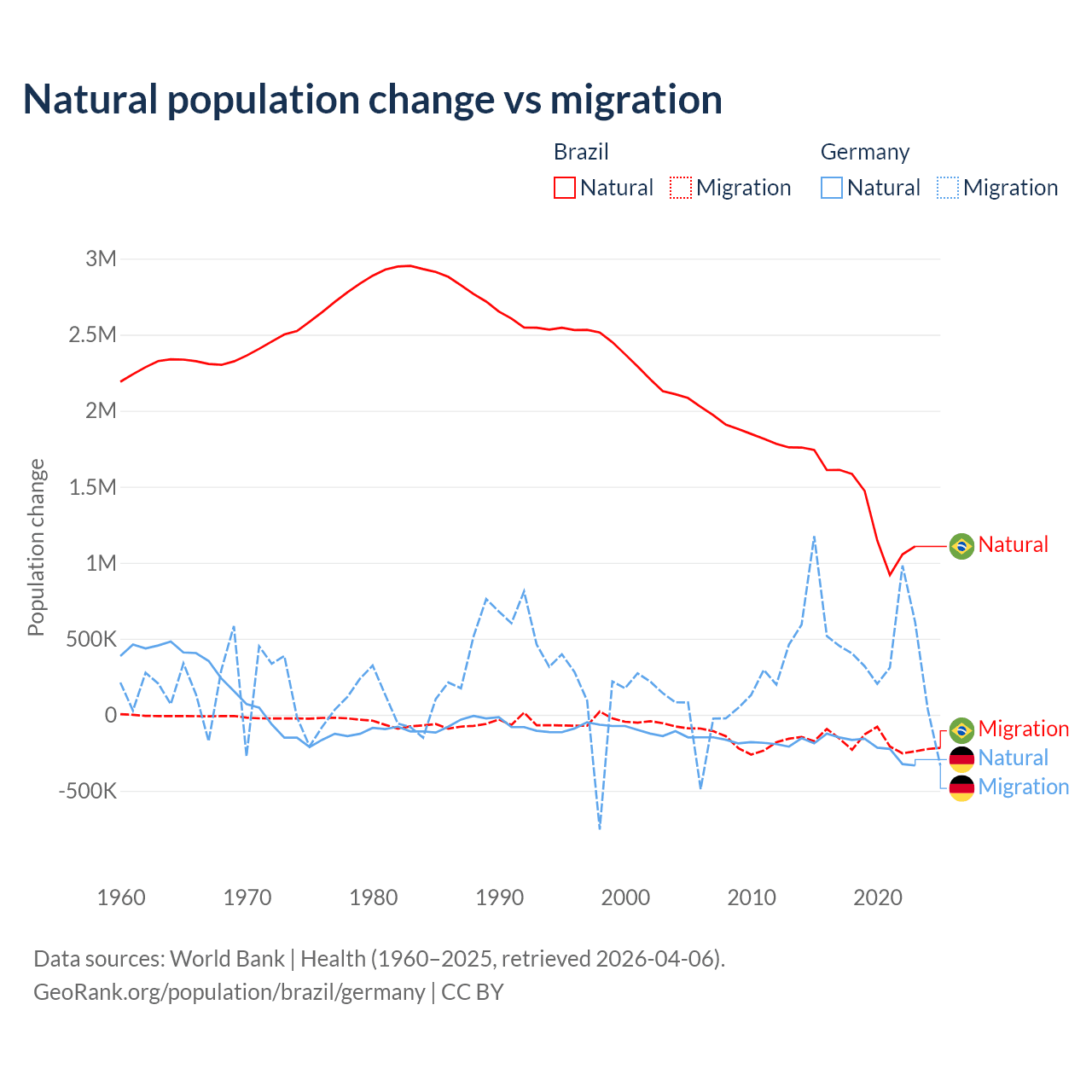 Over the last 10 years, 89.1% of the population change in Brazil is from natural causes (a gain of 14,004,164 people) and 10.9% is from migration (a loss of 1,708,894 people). In Germany 26.8% is from natural causes (a loss of 2,036,130 people) and 73.2% is from migration (a gain of 5,565,916 people).