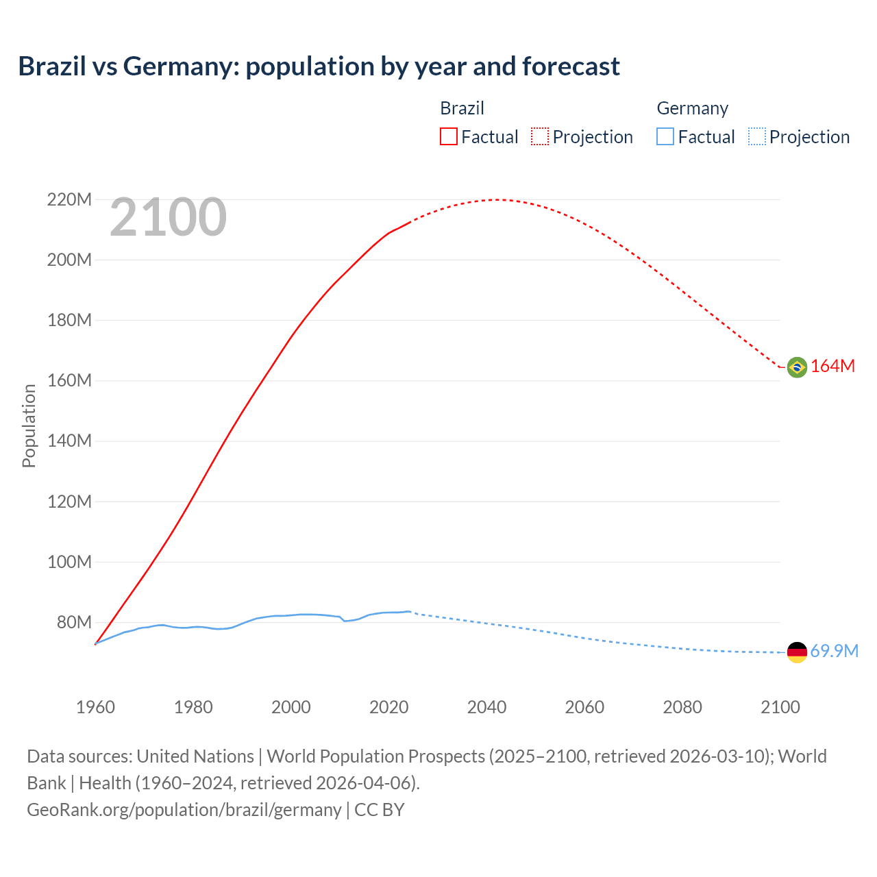 The latest officially reported population of Brazil was 211,998,573 in 2024 vs 83,516,593 people in Germany in 2024. In 2026, based on the adjusted UN estimation, the current Brazil's population is 213,824,938 people compared to 82,575,542 in Germany.