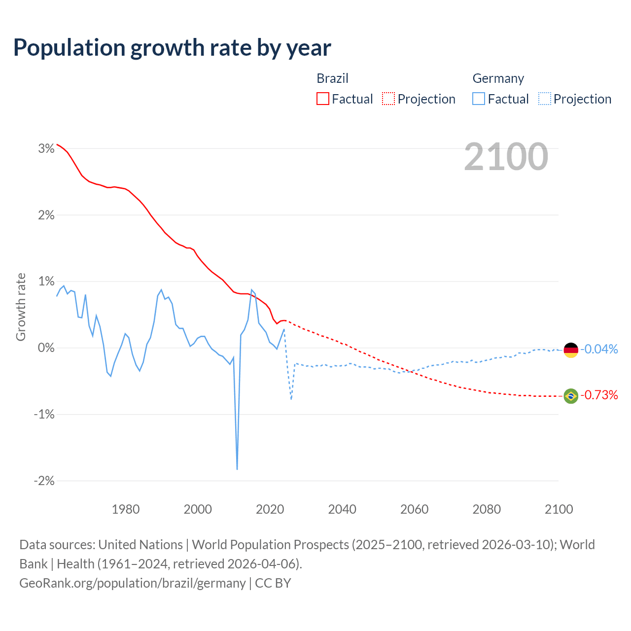 - For the last 10 years, Brazil has had an average growth rate of +0.6% per year vs +0.32% in Germany.