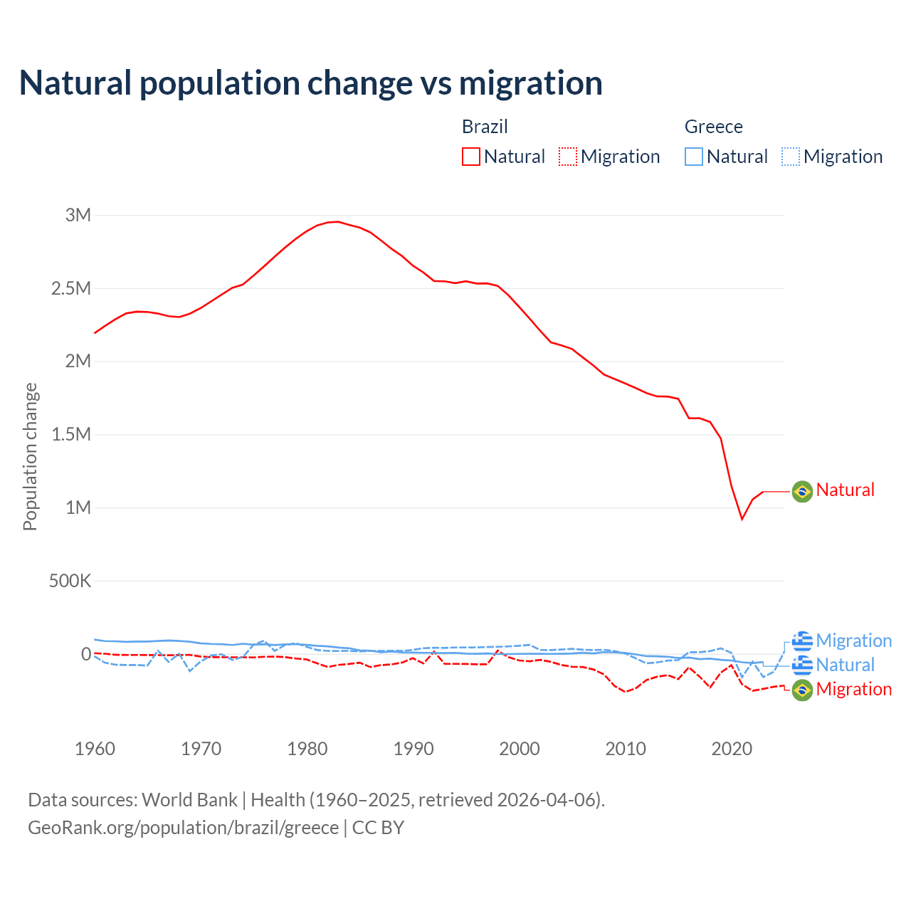 Over the last 10 years, 89.1% of the population change in Brazil is from natural causes (a gain of 14,004,164 people) and 10.9% is from migration (a loss of 1,708,894 people). In Greece 51.9% is from natural causes (a loss of 411,426 people) and 48.1% is from migration (a loss of 381,824 people).