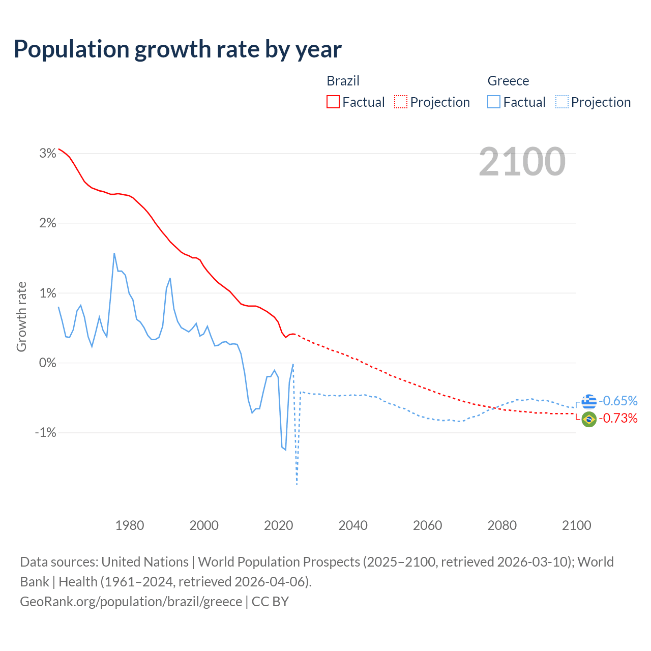 - For the last 10 years, Brazil has had an average growth rate of +0.6% per year vs -0.47% in Greece.