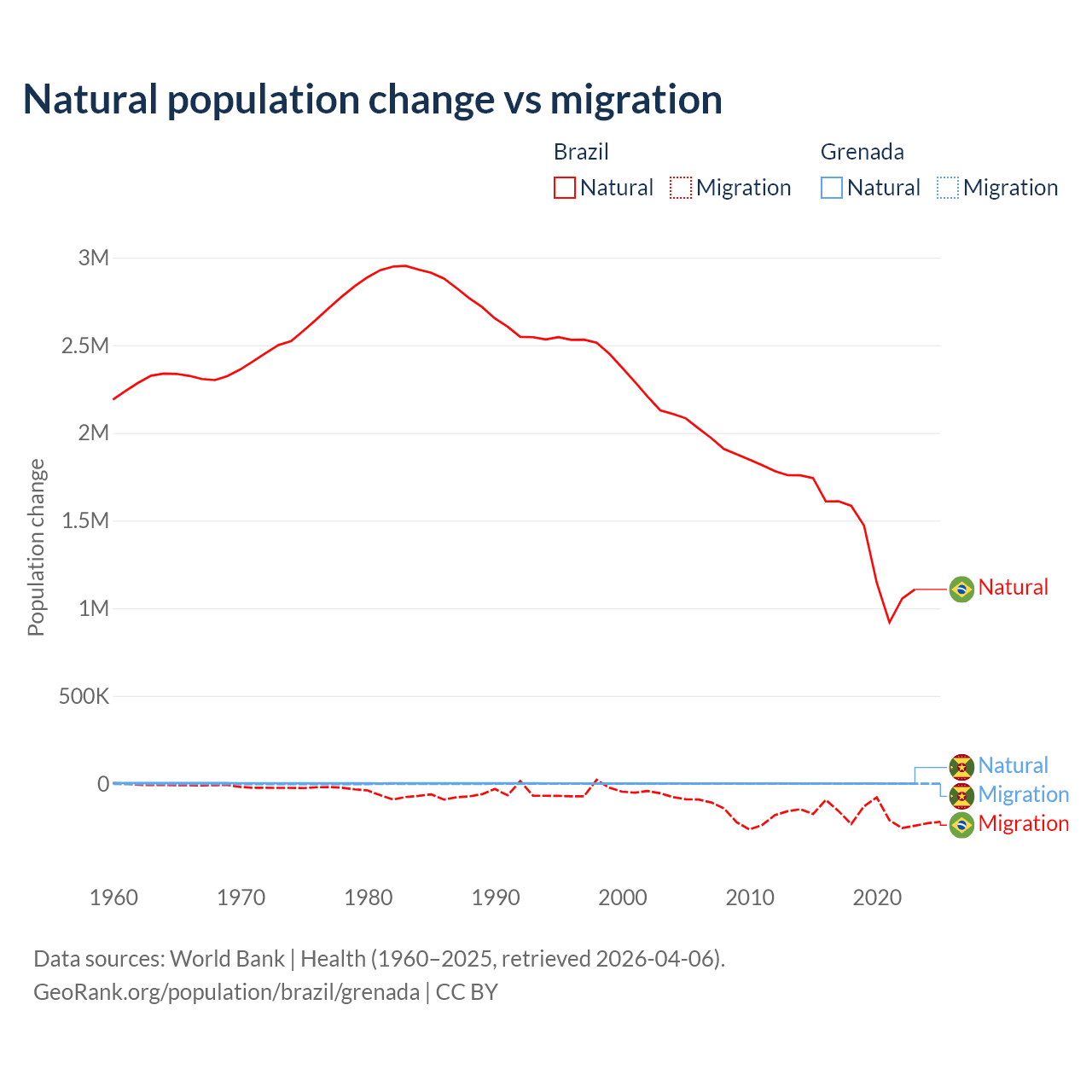 Over the last 10 years, 89.1% of the population change in Brazil is from natural causes (a gain of 14,004,164 people) and 10.9% is from migration (a loss of 1,708,894 people). In Grenada 76% is from natural causes (a gain of 4,850 people) and 24% is from migration (a loss of 1,535 people).