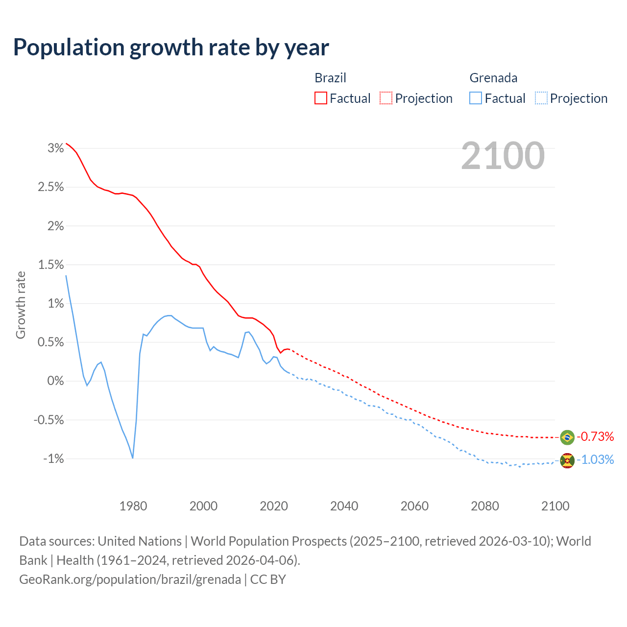 - For the last 10 years, Brazil has had an average growth rate of +0.6% per year vs +0.29% in Grenada.