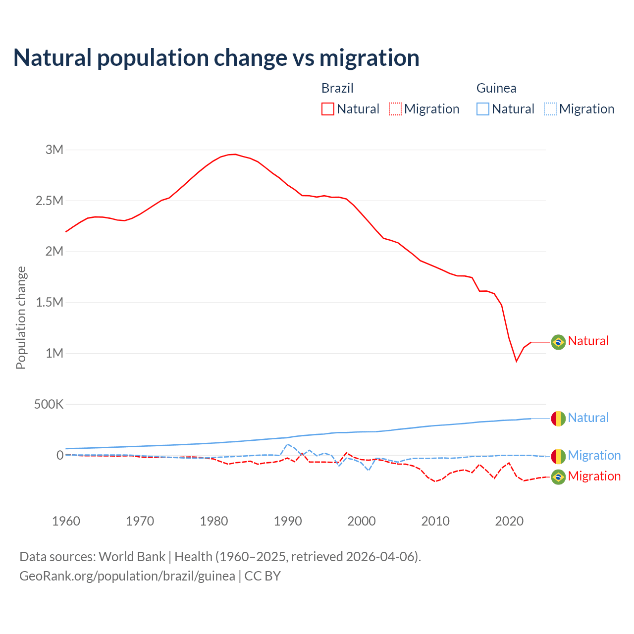 Over the last 10 years, 89.1% of the population change in Brazil is from natural causes (a gain of 14,004,164 people) and 10.9% is from migration (a loss of 1,708,894 people). In Guinea 97.2% is from natural causes (a gain of 3,346,936 people) and 2.76% is from migration (a loss of 94,924 people).