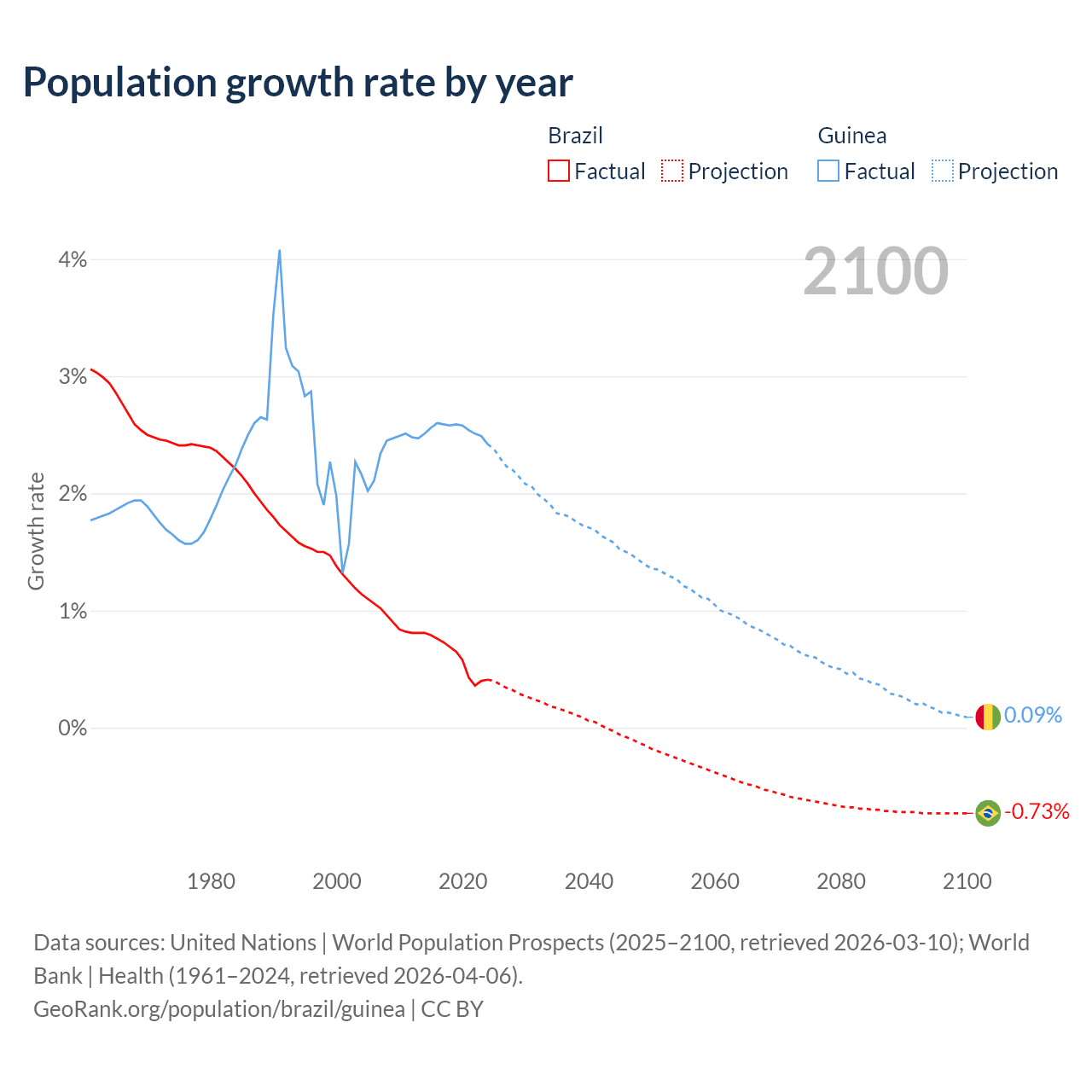 - For the last 10 years, Brazil has had an average growth rate of +0.6% per year vs +2.54% in Guinea.