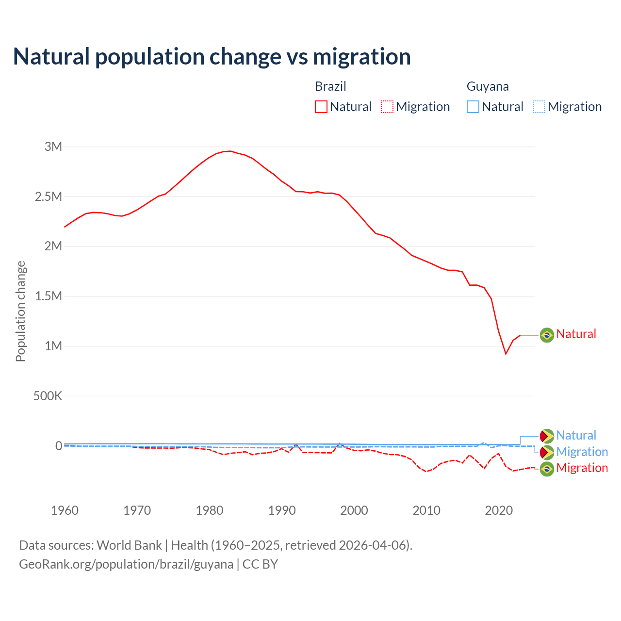 Over the last 10 years, 89.1% of the population change in Brazil is from natural causes (a gain of 14,004,164 people) and 10.9% is from migration (a loss of 1,708,894 people). In Guyana 77.7% is from natural causes (a gain of 107,419 people) and 22.3% is from migration (a loss of 30,797 people).