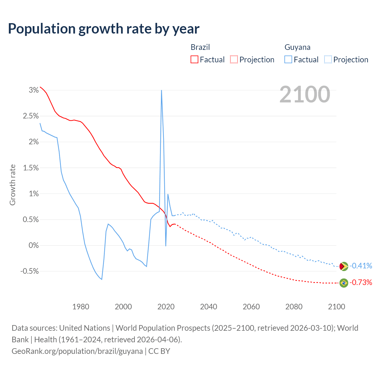 - For the last 10 years, Brazil has had an average growth rate of +0.6% per year vs +0.94% in Guyana.