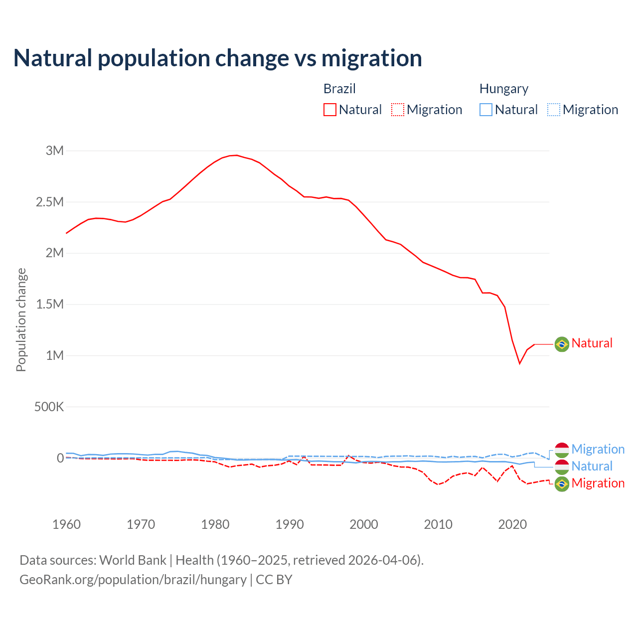 Over the last 10 years, 89.1% of the population change in Brazil is from natural causes (a gain of 14,004,164 people) and 10.9% is from migration (a loss of 1,708,894 people). In Hungary 63.7% is from natural causes (a loss of 412,838 people) and 36.3% is from migration (a gain of 234,837 people).