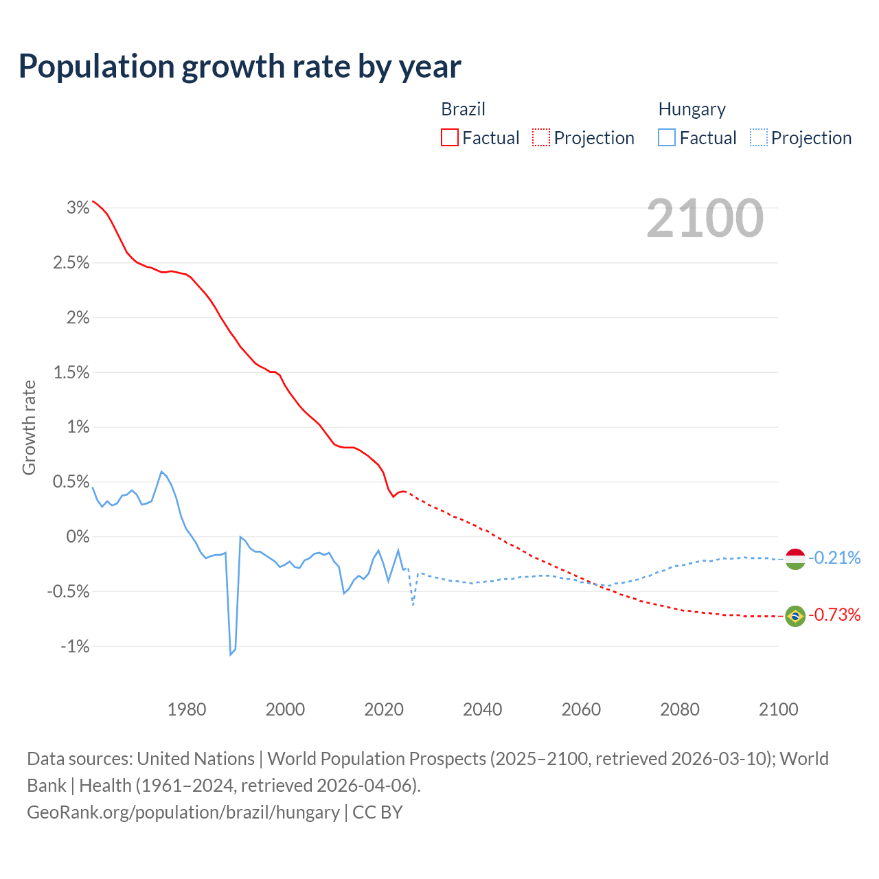- For the last 10 years, Brazil has had an average growth rate of +0.6% per year vs -0.29% in Hungary.