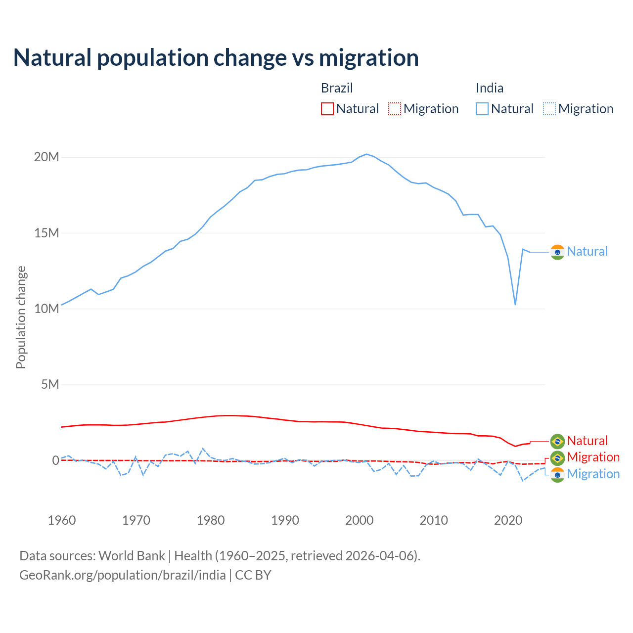 Over the last 10 years, 89.1% of the population change in Brazil is from natural causes (a gain of 14,004,164 people) and 10.9% is from migration (a loss of 1,708,894 people). In India 96.4% is from natural causes (a gain of 145,503,378 people) and 3.56% is from migration (a loss of 5,376,884 people).
