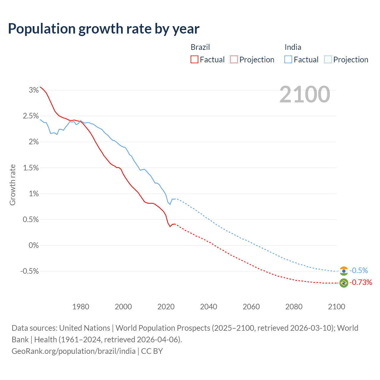 - For the last 10 years, Brazil has had an average growth rate of +0.6% per year vs +1.03% in India.