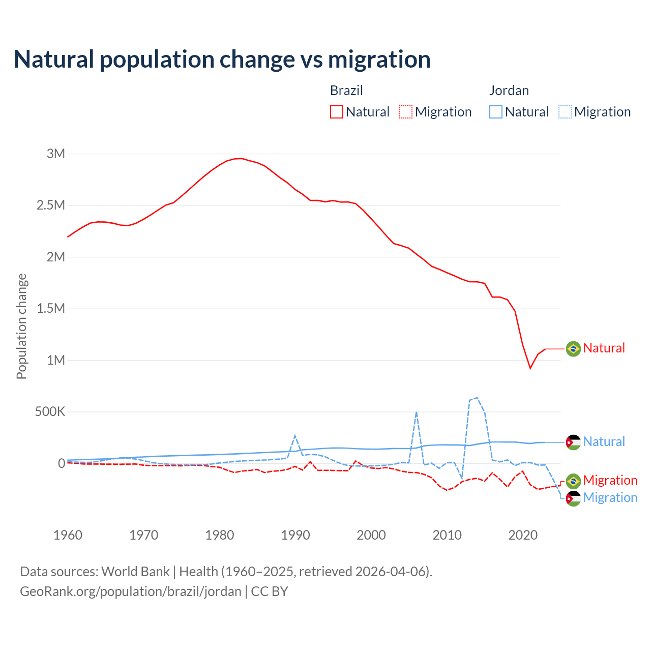 Over the last 10 years, 89.1% of the population change in Brazil is from natural causes (a gain of 14,004,164 people) and 10.9% is from migration (a loss of 1,708,894 people). In Jordan 63.2% is from natural causes (a gain of 1,991,452 people) and 36.8% is from migration (a gain of 1,157,625 people).