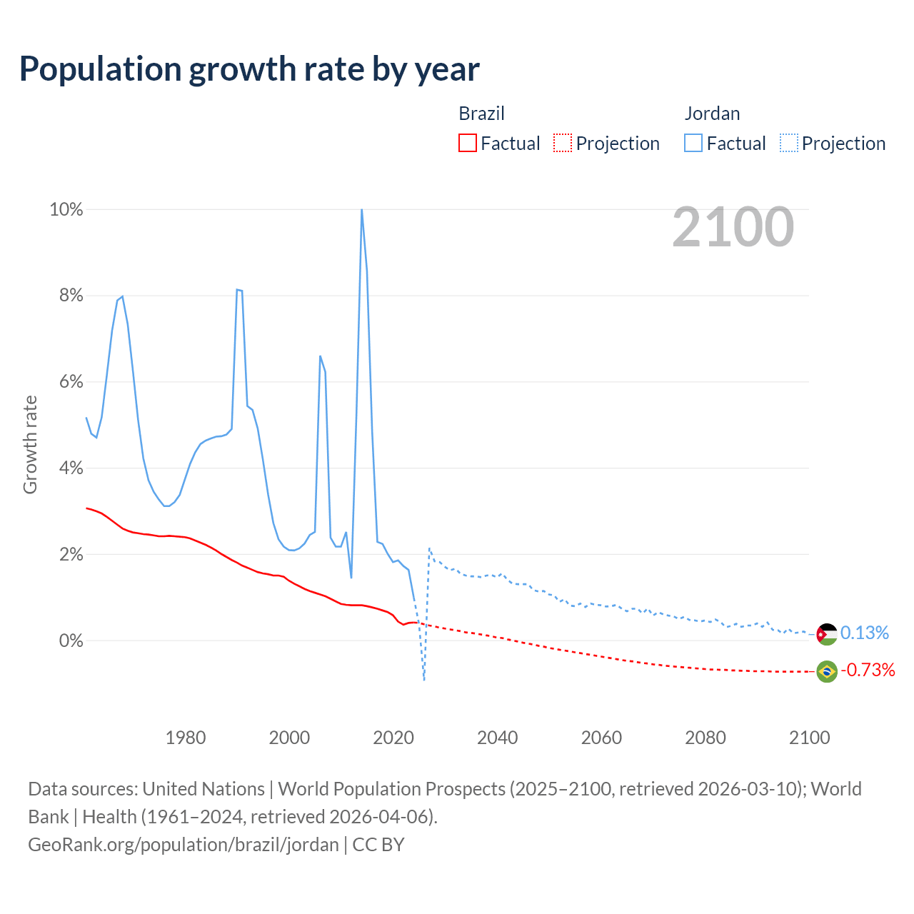 - For the last 10 years, Brazil has had an average growth rate of +0.6% per year vs +3.45% in Jordan.