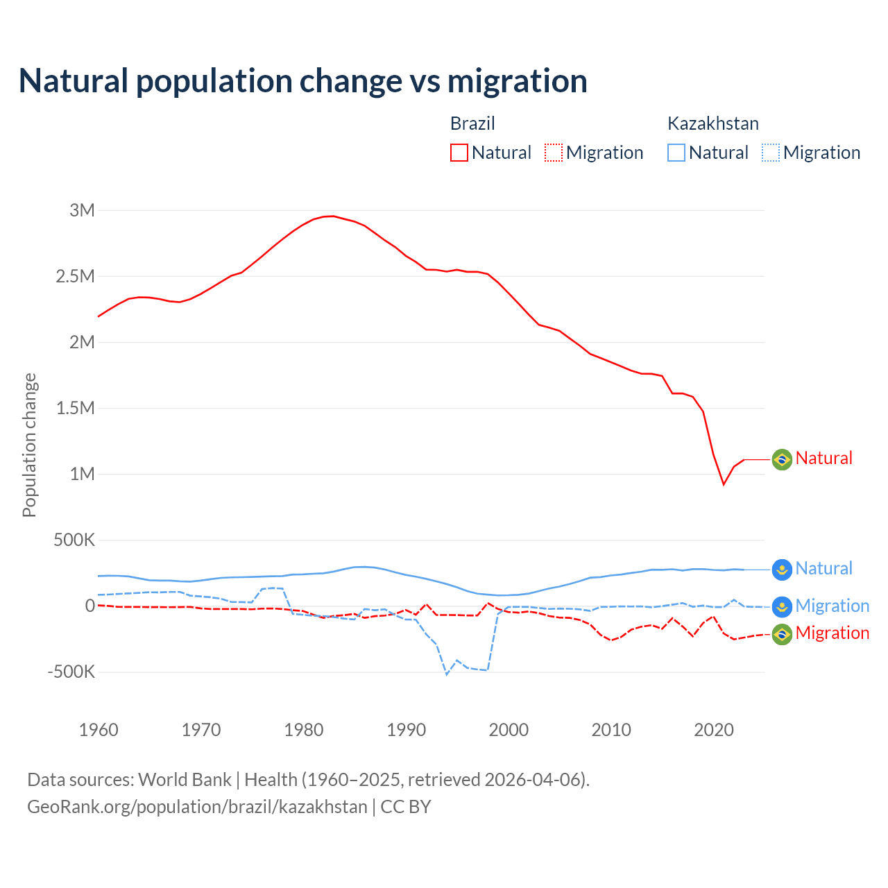 Over the last 10 years, 89.1% of the population change in Brazil is from natural causes (a gain of 14,004,164 people) and 10.9% is from migration (a loss of 1,708,894 people). In Kazakhstan 98.7% is from natural causes (a gain of 2,743,094 people) and 1.33% is from migration (a gain of 36,908 people).