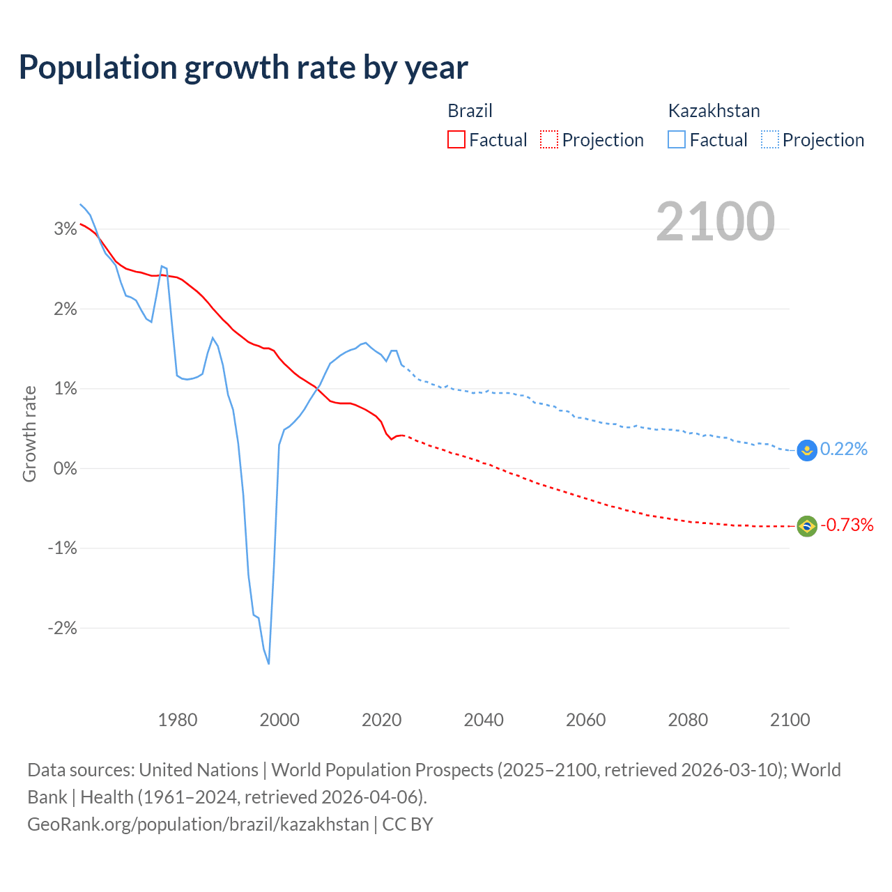 - For the last 10 years, Brazil has had an average growth rate of +0.6% per year vs +1.46% in Kazakhstan.