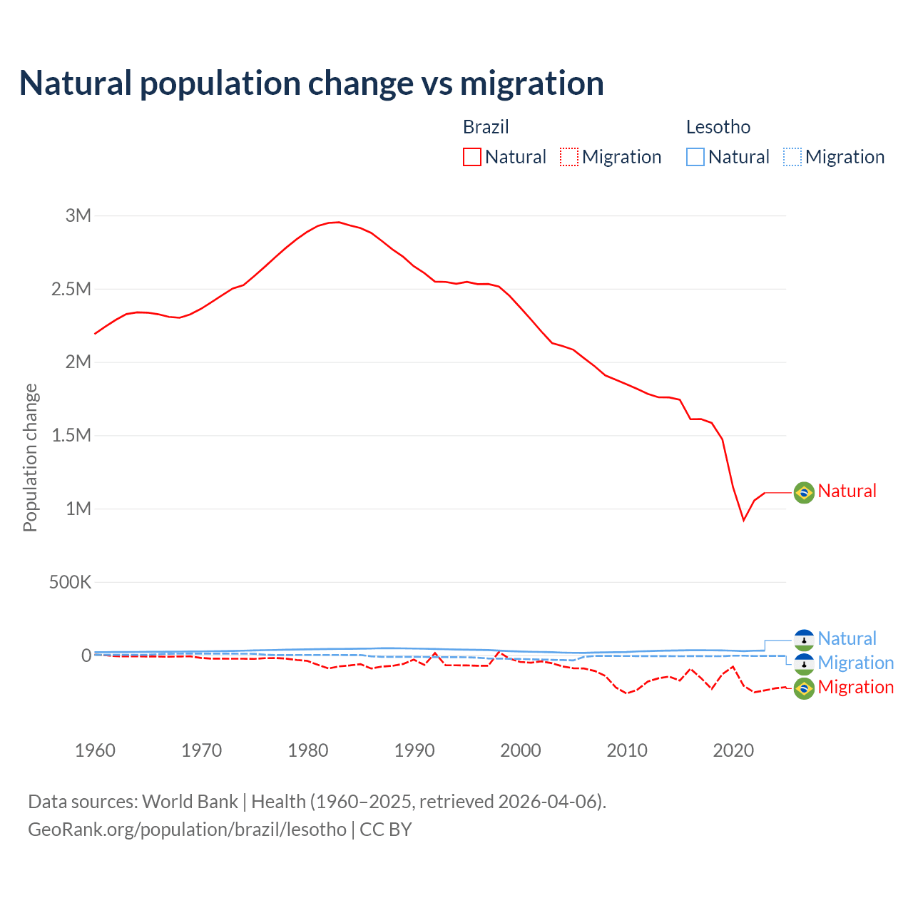 Over the last 10 years, 89.1% of the population change in Brazil is from natural causes (a gain of 14,004,164 people) and 10.9% is from migration (a loss of 1,708,894 people). In Lesotho 84.2% is from natural causes (a gain of 315,836 people) and 15.8% is from migration (a loss of 59,457 people).