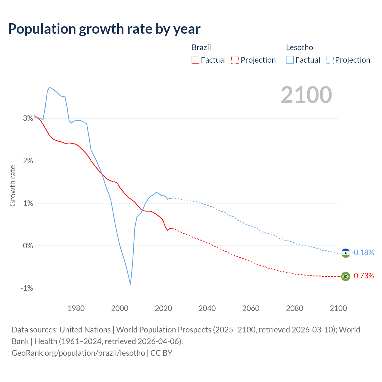 - For the last 10 years, Brazil has had an average growth rate of +0.6% per year vs +1.17% in Lesotho.