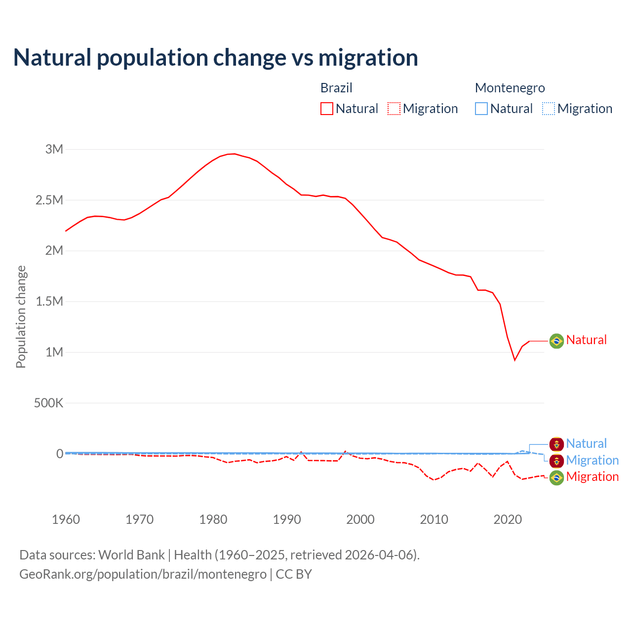 Over the last 10 years, 89.1% of the population change in Brazil is from natural causes (a gain of 14,004,164 people) and 10.9% is from migration (a loss of 1,708,894 people). In Montenegro 52.4% is from natural causes (a gain of 4,501 people) and 47.6% is from migration (a gain of 4,095 people).
