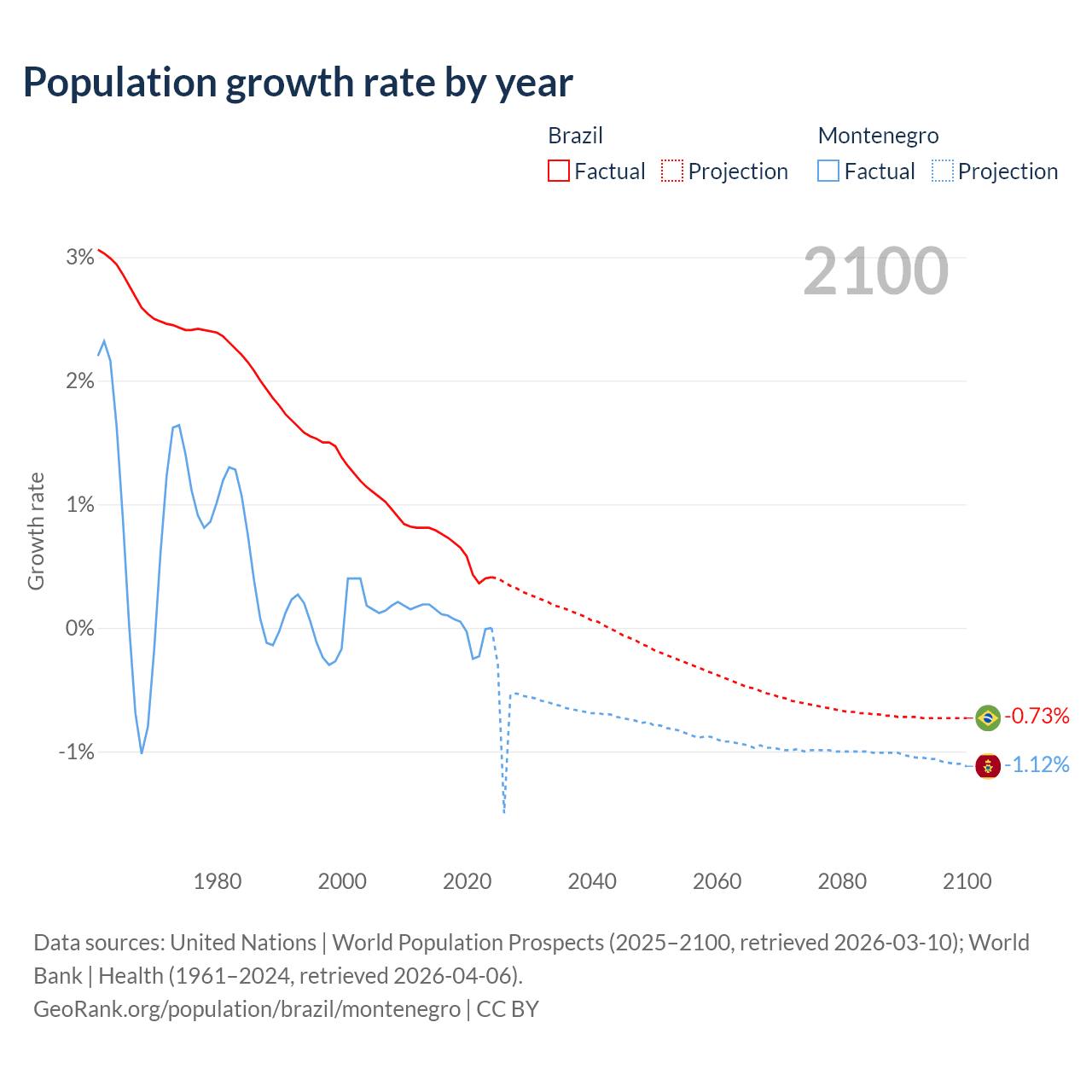- For the last 10 years, Brazil has had an average growth rate of +0.6% per year vs +0.01% in Montenegro.