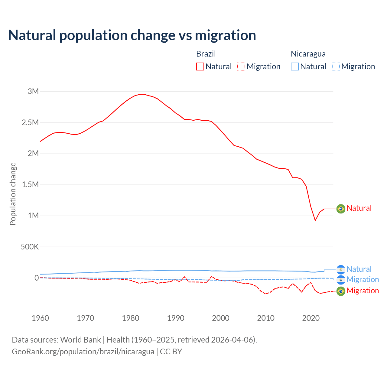 Over the last 10 years, 89.1% of the population change in Brazil is from natural causes (a gain of 14,004,164 people) and 10.9% is from migration (a loss of 1,708,894 people). In Nicaragua 85.5% is from natural causes (a gain of 1,017,084 people) and 14.5% is from migration (a loss of 172,078 people).