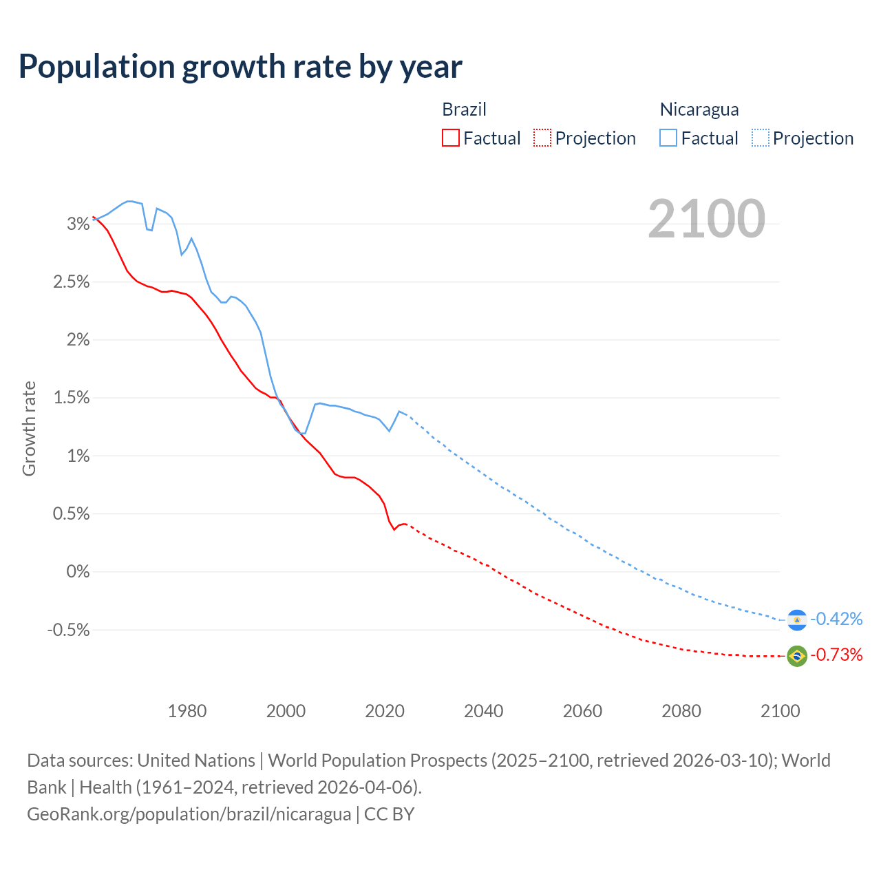 - For the last 10 years, Brazil has had an average growth rate of +0.6% per year vs +1.33% in Nicaragua.